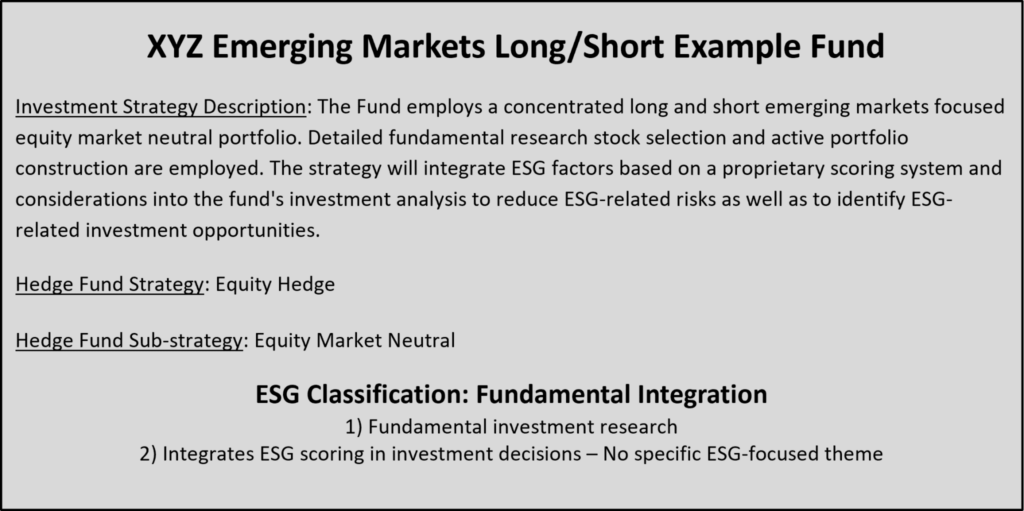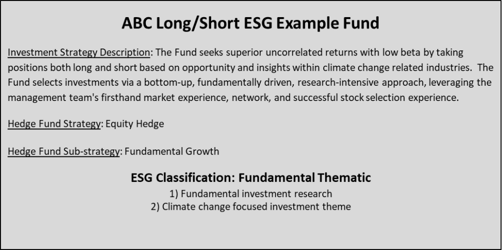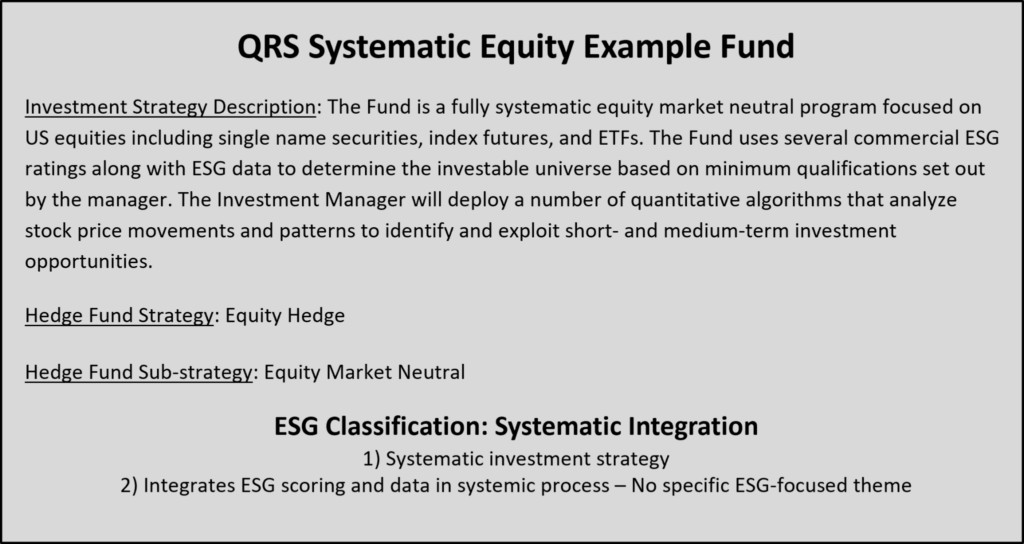 フレームワークの次のレイヤーの分類は、投資戦略に基づいてファンドを整理します。第2レイヤーは5つのカテゴリに分けられます: ファンダメンタルズ、, システマティック、, マクロ、,アービトラージ、またはファンド・オブ・ファンズ。テーマまたは統合のESG分類を上記の投資カテゴリと組み合わせることで、フレームワークの基礎が得られます。マクロ、アービトラージ、ファンド・オブ・ファンズについてはすぐに再び取り上げますが、ファンダメンタルズとシステマティックなファンド戦略(最大のサブカテゴリ)の間の区分を理解することが極めて重要です。